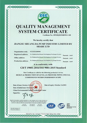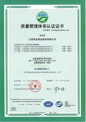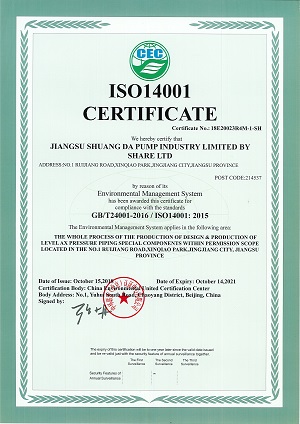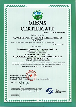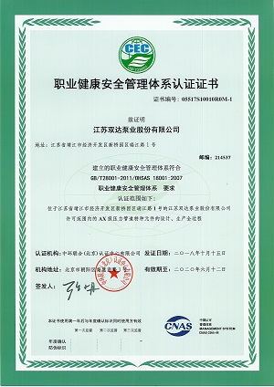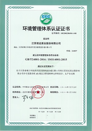 經(jīng)過專家組嚴(yán)格審核,江蘇雙達(dá)泵業(yè)股份有限公司收到中環(huán)聯(lián)合認(rèn)證中心簽發(fā)的質(zhì)量、環(huán)境、職業(yè)健康安全三體系認(rèn)證證書。